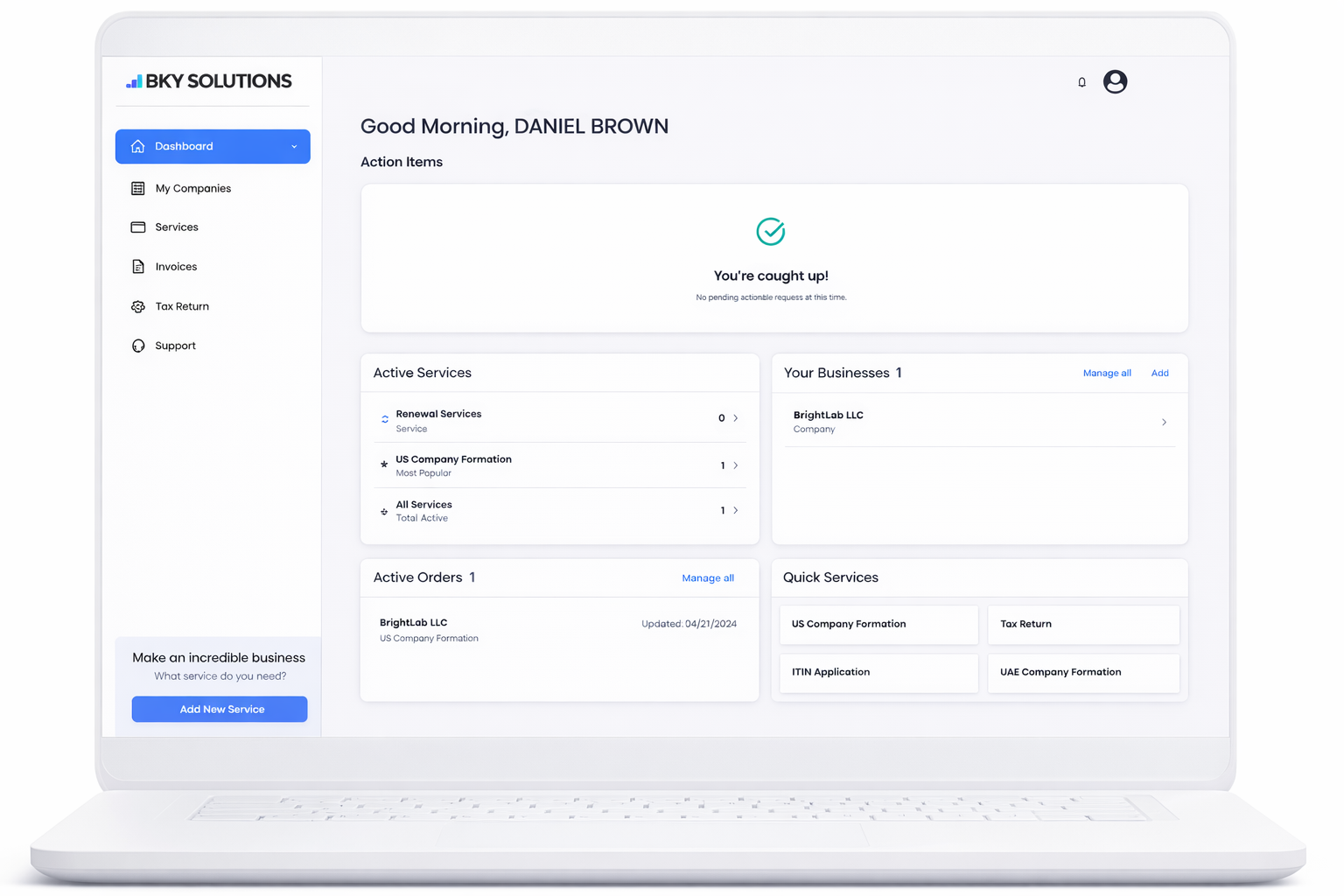 We provide entrepreneurs with a seamless, guided experience for forming and managing companies in the U.S. and UAE. From formation to tax filings, annual reports, and EIN/ITIN applications – we handle everything with speed, accuracy, and transparent pricing. BKY Solutions delivers reliable, compliant support.